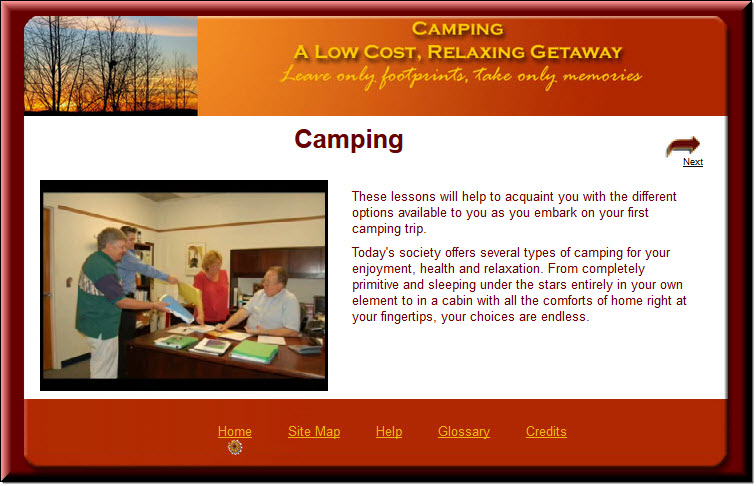 Camping Next → Created for as group project in xHTML Camping lessons were created for a class, Problems in Instructional Design. See Camping lessons.